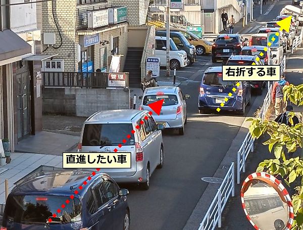 踏切に近い約30mの区間は、道路の幅が広く整備されているため、車が2列で通行できます。しかし、それ以外の区間では2列で通行することができません。上の写真を見ると、交差点を直進したい車が右折渋滞の影響を受けていることがわかります。もう少し車道を広げて2列で通行できるようにすれば、渋滞は緩和されると考えます。