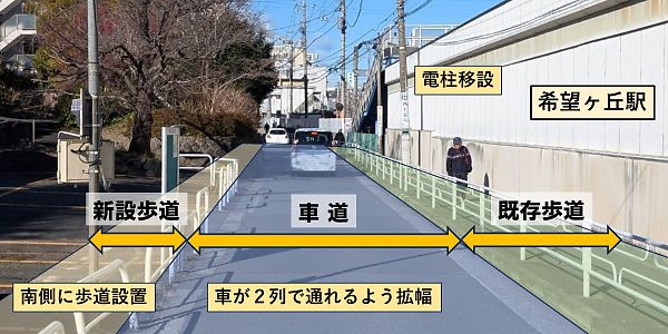 ・車が2列で通れるよう車道を拡幅する。 ・南側にも歩道を設置する。 ・既存歩道の電柱を移設して、歩道を通りやすくする。