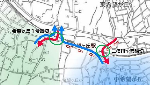 特に交通量が多い土曜昼間などは、希望ヶ丘1号踏切を基点とした渋滞が発生するのは避けられません。また、踏切と2箇所の交差点が近いため、これも渋滞の原因となっています。