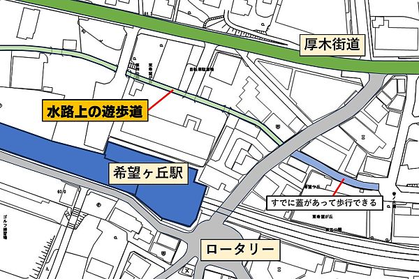 水路に蓋をして通れるようにすることで、希望ヶ丘駅北西方面の住民の駅へのアクセスが向上します。