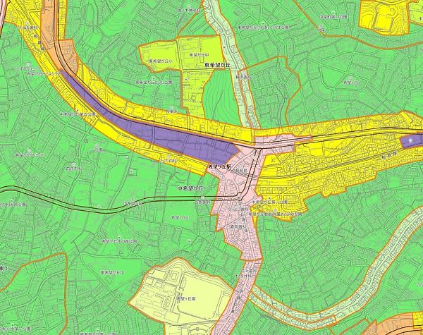 希望ヶ丘駅周辺とバス通りにに沿った「桃色」の地域は、「近隣商業地域」で、近隣の住宅地に住む